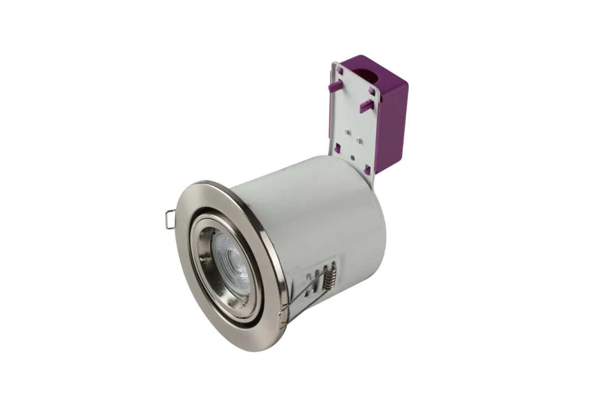 - STARLING 50W Mains Voltage Steel Fire Rated Downlight, IP20, 100mm, Brushed Chrome, Directional